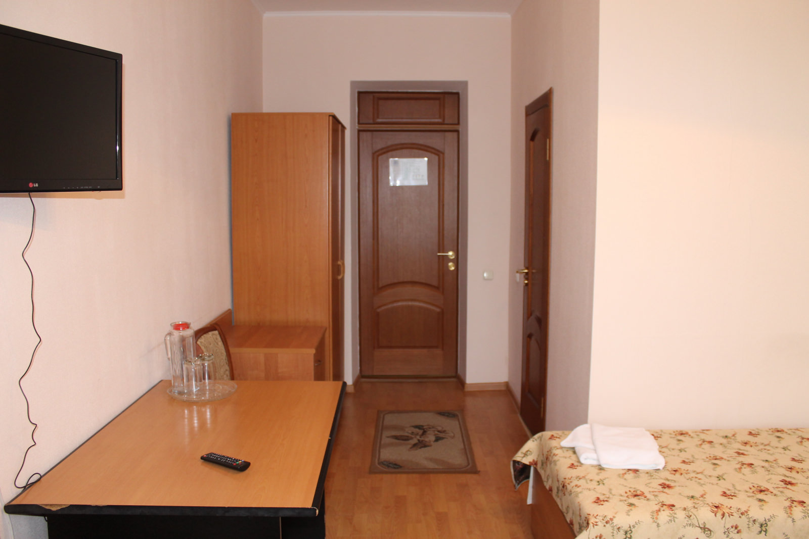 2 осн. места. Мебель: вешалка, зеркало, кровати односпальные, прикроватные тумбочки, стол, стулья, шкаф. Оборудование: телевизор, телефон, холодильник. Санузел. Сервис: Wi-Fi бесплатно, смена полотенец, смена постельного белья, уборка номера.